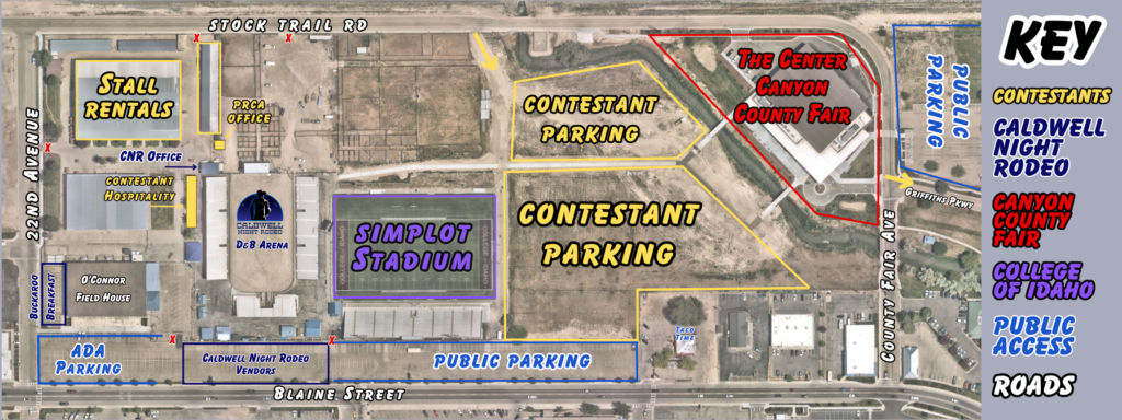 Contestants – please do not park or layover at the Caldwell Night Rodeo Grounds the week prior to rodeo. You may reach out to Outback Stallion Station for rentals leading up to August 10th.