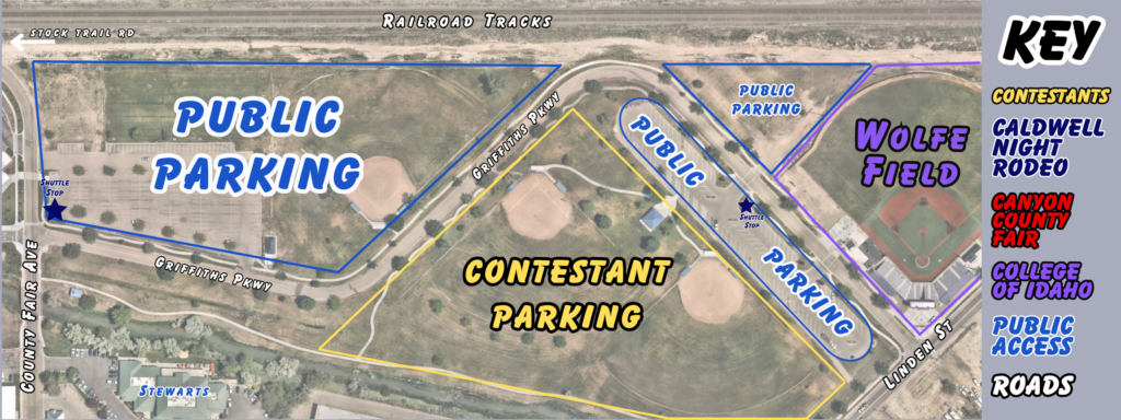 Where should I Park? Due to CNR’s location in a busy area of Caldwell, public and free parking can be tricky to find. ADA Parking is available first come, first serve in front of O’Connor Field House (2207 Blaine St). Please be careful and DO NOT park along the railroad tracks, this is illegal and dangerous. We recommend parking to the east of The Center at Canyon County Fair and utilizing the shuttle stops available. Many nearby businesses will allow local groups such as 4-H & FFA to use their lot for paid parking. If you choose this route, thank you for giving back to our community. There are a few parking maps on our Arena Map page of the website or at the bottom of this page.